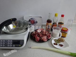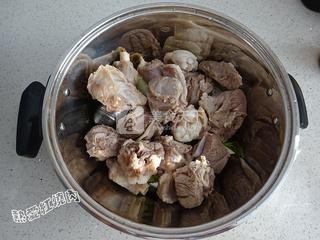 捷赛自动锅内放入1000毫升冷水,加入带骨羊腿块后按开关键,滚动把手处轮子调最大火把羊腿块煮开焯烫3分钟,然后捞出来用温水洗去羊腿肉上的杂质控干水分备用。