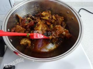 将内胆放入锅体内,盖好盖子,按收汁红烧肉功能键,烹饪程序自动运行。
